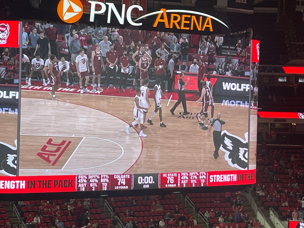 The crowd was somewhat muted throughout the game perhaps in shock at the thought of losing. It came down to the last play when a NC State player Manny Seaborn was fouled on a very questionable call. The two foul shots put them up by two. After Colgate threw a long pass down the other end of the court, a Colgate player fouled, sending the Wolfpack back to the line. A replay review confirmed that the foul occurred before time had ended. The NC State player missed the foul shot. Colgate then attempted a three quarter court shot to win the game but was not even close. I was hoping to see a replay of UC Riverside’s upset over Arizona State.