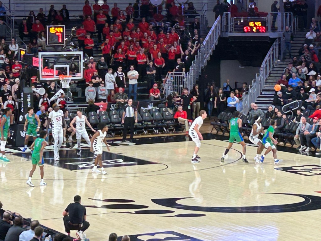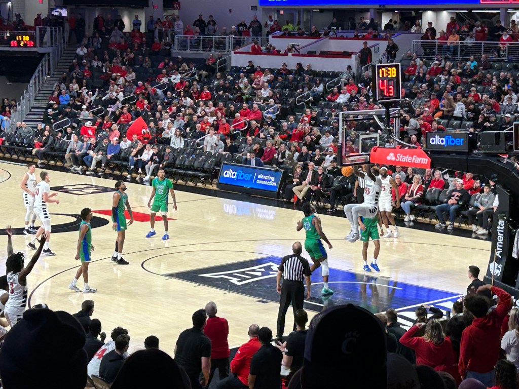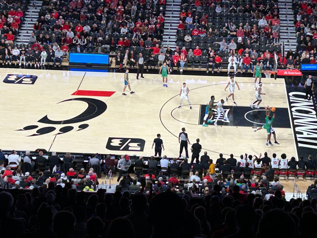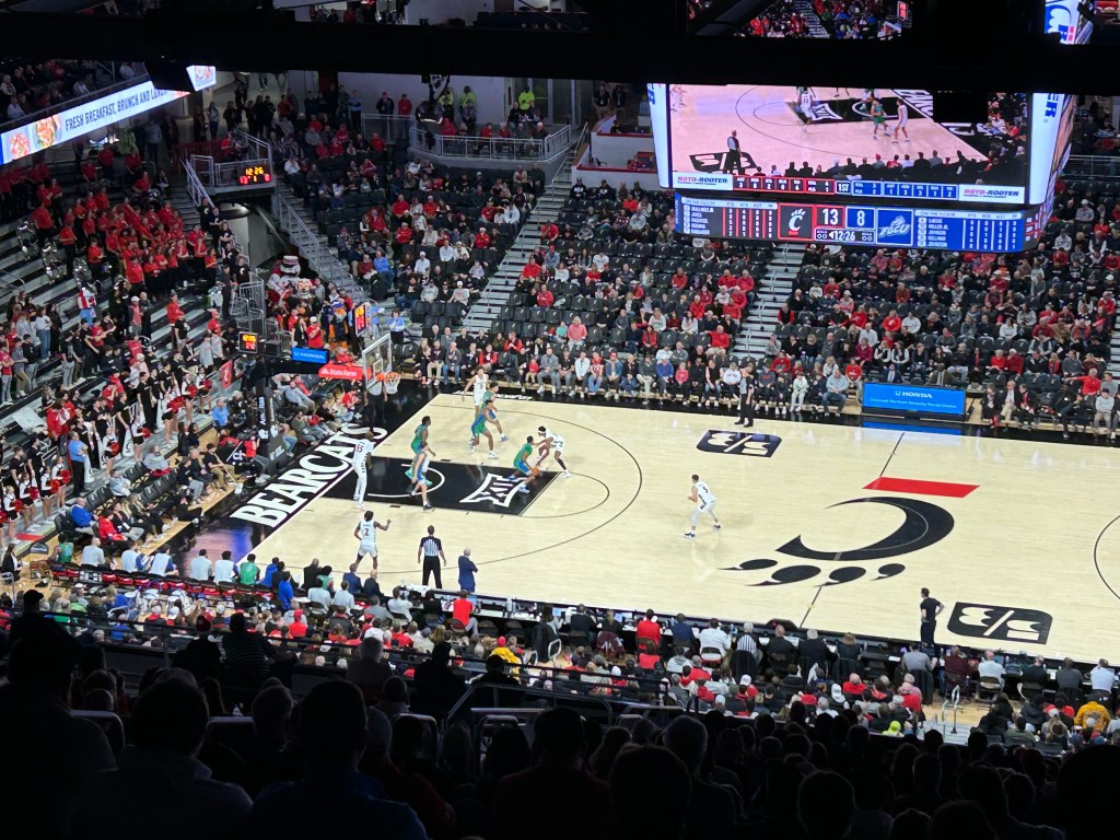 As I was exiting the arena, I followed a crowd downstairs thinking that this would lead to an exit. Much to my surprise, fans were lining up to give high fives to the Bearcat players. I did as well even though I felt like an imposter.
