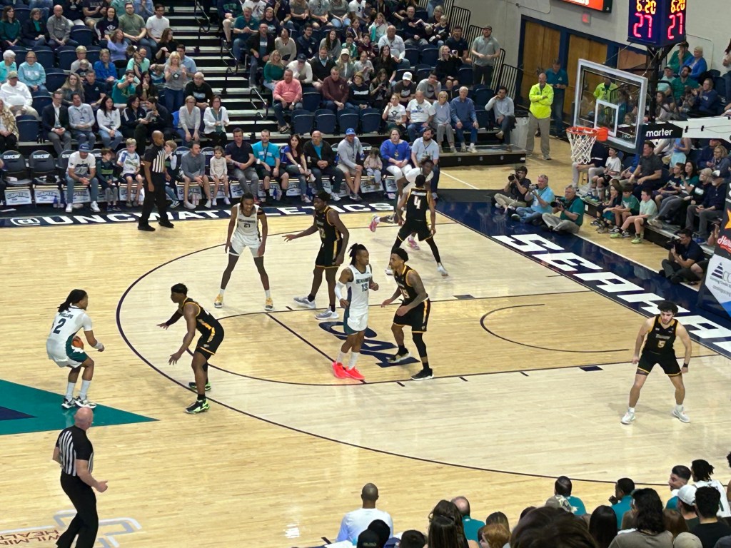This was a critical game for both teams. UNC Wilmington Seahawks is tied for third in the Colonial Athletic Conference. Towson is in fourth place. I could tell by the crowd reactions that these two teams were rivals. I was sitting in front of a guy who literally complained about each call against his Seahawks. He was probably correct about 10% of the time.