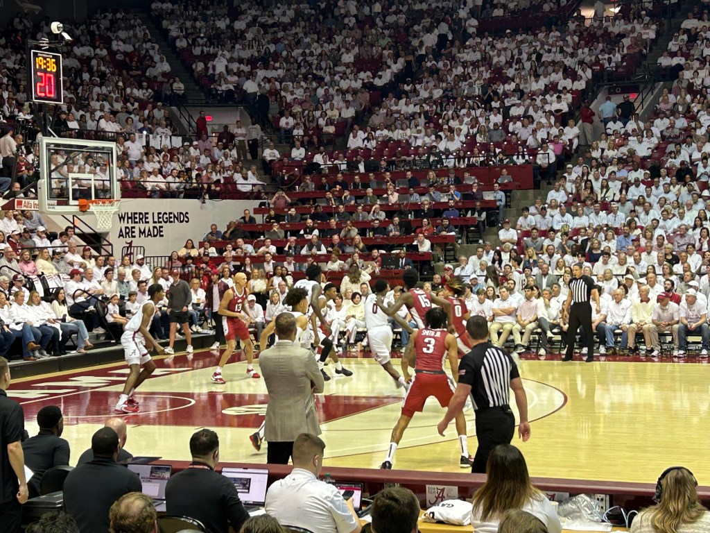 Nita pointed out Alabama football coach Nick Saban sitting under the basket at the far end. Next to him was a man with a backwards sitting cap showing a movement in a golf swing. It turns out that this gentleman was Alabama alumnus golf pro Justin Thomas. Thomas came out during a time out to cheer the crowd on.
